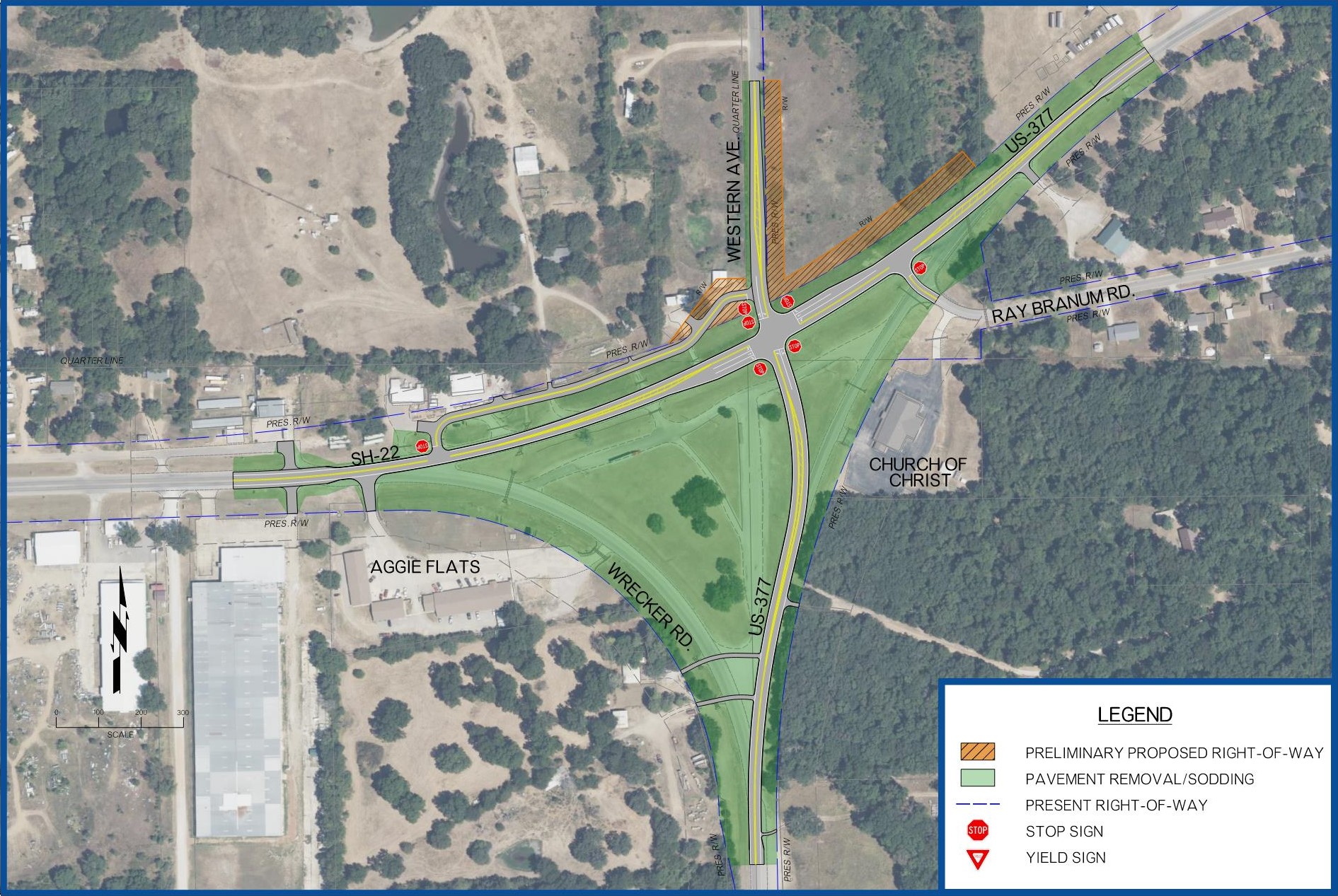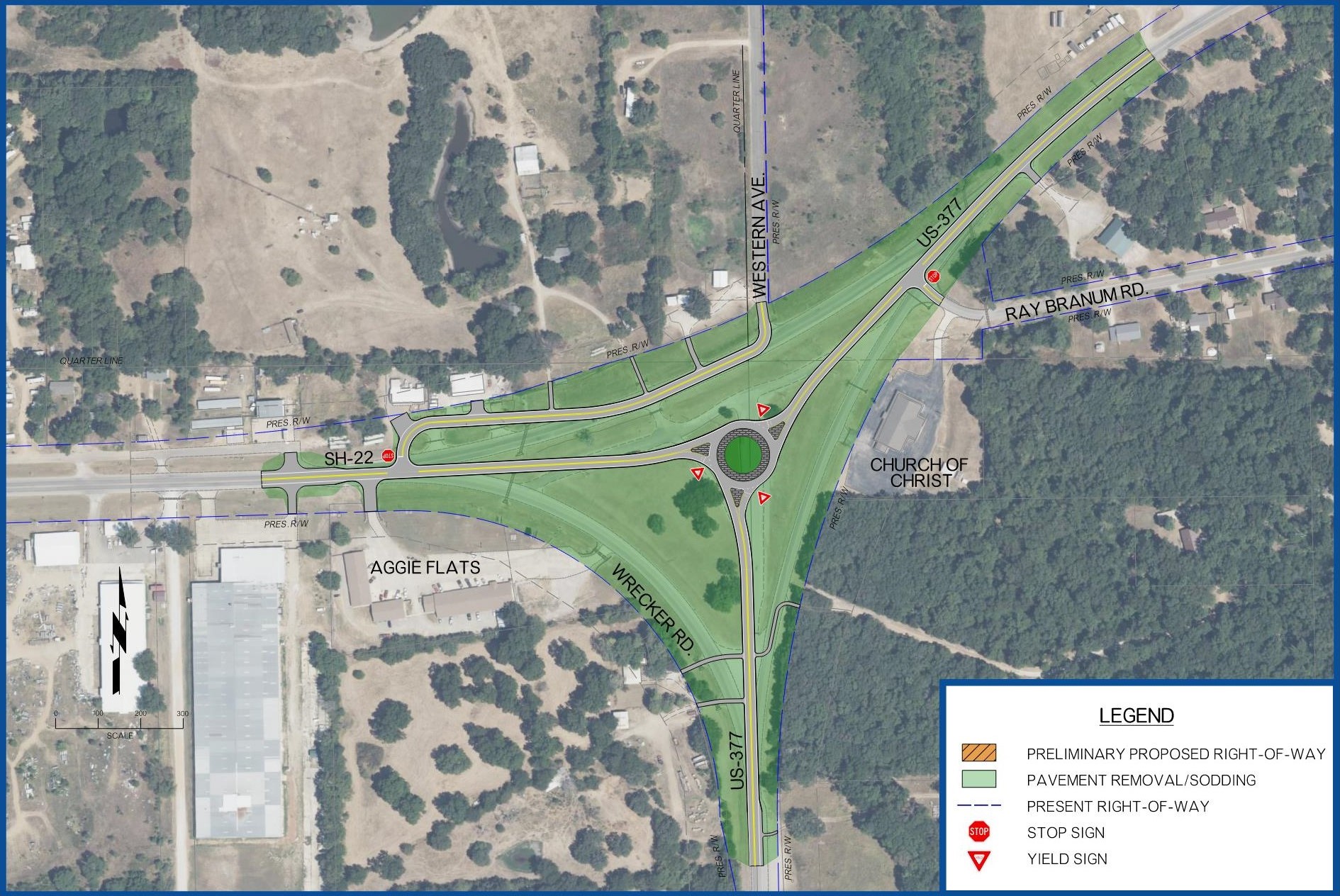 This alternative consists of realigning each leg of SH-22 and US-377 to create a three-legged roundabout in the center of the existing Y-intersection.