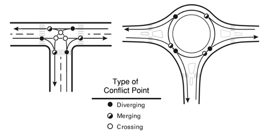 Modern Roundabouts are a common form of unsignalized intersection in use throughout the world. In a roundabout intersection, one-way traffic moves around a central island, and entering traffic must yield to circulating traffic. Modern roundabouts maximize safety by significantly reducing conflict points and minimize traffic delay since traffic does not have to take turns to use the intersection like at a traffic signal. Roundabouts are also more cost effective than traffic lights as they eliminate hardware, maintenance and electrical costs associated with the signals.