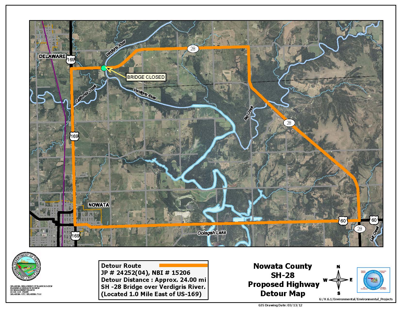 The project is currently scheduled to be let for construction in Federal Fiscal Year 2020 and will necessitate closure of the bridge and the approach roadway on State Highway 28. It is anticipated that the road closure will last approximately 270 days, with incentives and disincentives to reduce the closure time. We are considering using the following as a state highway detour during the bridge closure: Eastbound - From Junction of US-169 and SH-28, proceed south on US-169 to Junction US-169/US-60, then east on US-60 to Junction US-60/SH-28 and then north and west on SH-28 (approximately 24 miles maximum) - see attached map. Once the project is let for construction, information on actual date of closure and duration of closure can be obtained from the ODOT Field Division at (918) 838-9933.