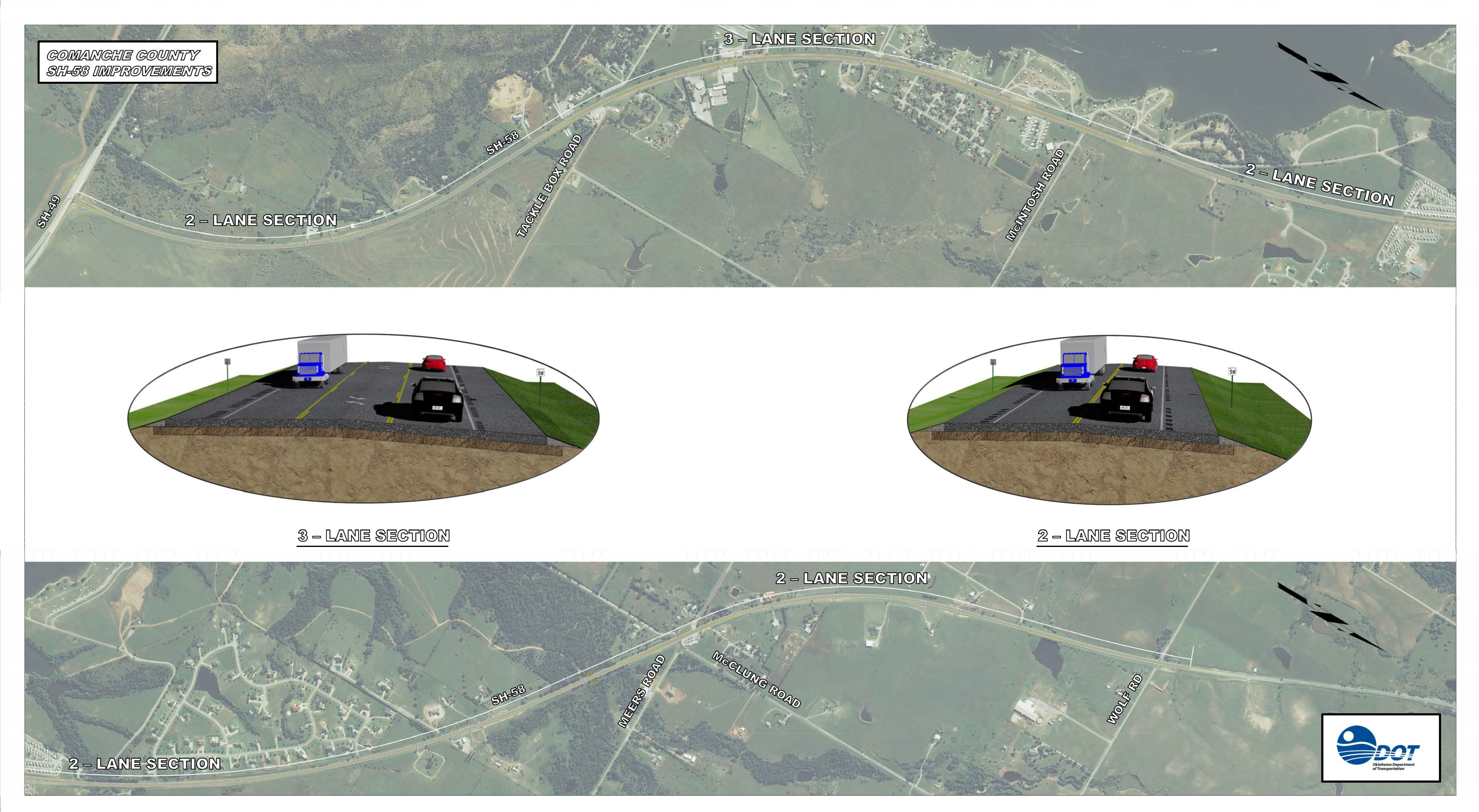 The Oklahoma Department of Transportation (ODOT), in cooperation with the Federal Highway Administration (FHWA), is proposing to improve State Highway 58 (SH-58) from State Highway 49 (SH-49) extending northwest approximately 6.4 miles to NW Wolf Road in Comanche County. ODOT has scheduled an Open House to present the project information and get public input. The Open House will use a come-and-go format. No formal presentation will be given so you can attend at your own convenience. The purpose of the Open House is to solicit public and agency input for the proposed changes to SH-58 for further consideration.