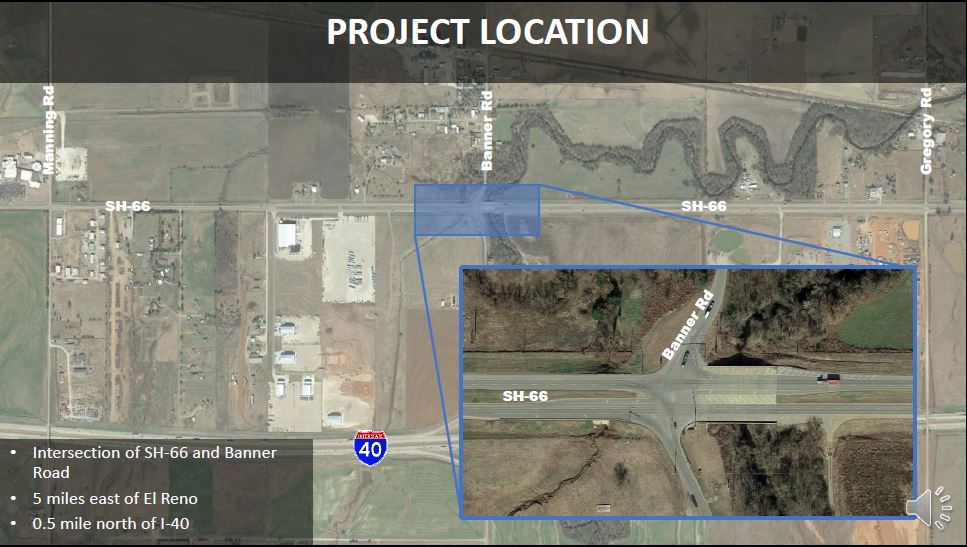 The Oklahoma Department of Transportation (ODOT), in partnership with Canadian County, proposes to make safety improvements at the intersection of SH-66 and Banner Road in Canadian County, Oklahoma. The current traffic speeds, existing intersection configuration, and control type on SH-66 are being considered for improvement. The purpose of the proposed improvements is to provide a safer intersection configuration, provide operational improvements to manage increasing traffic volumes, and provide improvements to better address vehicular movements. Recent traffic counts at the intersection range from approximately 5,100 vehicles per day (vpd) to 6,500 vpd on SH-66 and 2,200 vpd to 3,500 vpd on Banner Road. Traffic volumes along this portion of the corridor are anticipated to increase in the future due to development in the area.