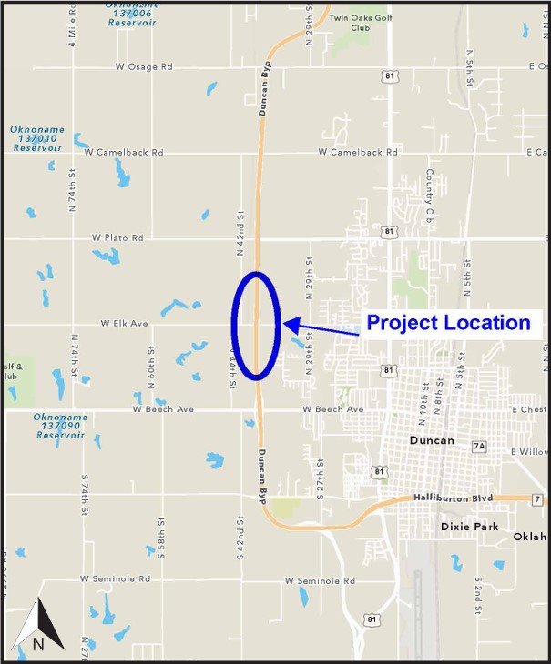 The Oklahoma Department of Transportation (ODOT), in cooperation and the Federal Highway Administration (FHWA), is proposing to improve the intersection of Duncan Bypass and Elk Avenue in Duncan, Stephens County. The current 2-way stop-controlled intersection requires safety improvements to accommodate future traffic growth and a future 4-lane divided highway. The purpose of the project is to improve intersection safety and operations.