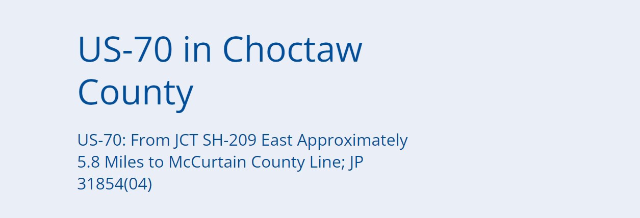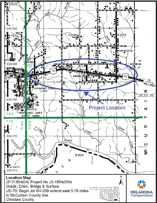 The current 2-lane roadway requires improvements to accommodate future traffic growth and to enhance safety. In 2002, an Environmental Assessment (EA) for US-70 was completed for the proposed construction of a new 4-lane highway and additional improvements for a portion of the US-70 corridor from 3.0 miles east to the US-70/SH-93 junction near Hugo to the junction of US-70/SH-98 in Choctaw and McCurtain counties. Since 2003, ODOT has constructed many of these improvements and is currently in the design process for improvements to US-70 from the junction of SH-209 east approximately 5.8 miles to the McCurtain County Line. A reevaluation of the original EA is being conducted for the continued improvements to the US-70 corridor.