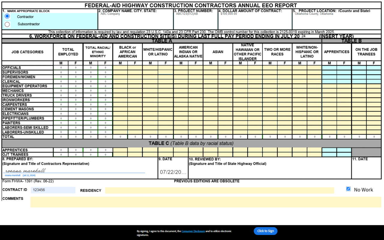 The purpose of the PR-1391 report is to show the composition of the workforce by race and gender for each craft classification. The employment data entered should reflect the work force on board during all or any part of the last full payroll period preceding the end of the month of July. The collection of this information is required by law and regulation 23 U.S.C. 140a and 23 CFR Part 230. The data is collected, combined and submitted by ODOT on the PR-1392.