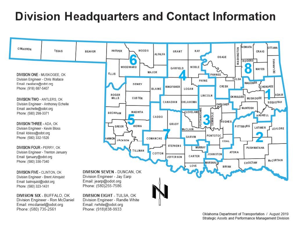 The Eight Year Construction Work Plan (CWP) contains capital improvement projects proposed for the state highway system, including bridge replacement or rehabilitation and highway improvements. ODOT’s eight Field Division Engineers, identified below, lead the effort in developing this fiscally balanced work plan, in consultation with local officials and the communities they represent. The CWP is updated each fall. The Oklahoma Transportation Commission approves the final product. The document’s projects are consistent with the policies of the LRTP. The CWP can be found here.