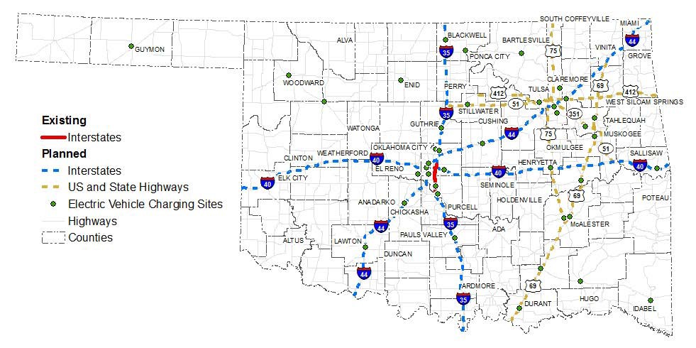 ODOT’s 2045 LRTP provides information about Oklahoma’s existing/ready and planned electric vehicle (EV) corridors. According to the U.S. Department of Transportation, alternative fuel corridor designations currently cover over 135,000 miles of the National Highway System (NHS) network. I-35, I-40, I-44, SR-51, SR-351, US-69, US-75, US-412 in Oklahoma. EV corridors that are Existing/Ready include only facilities that have: DC fast charging equipment, stations located every 50 miles within five miles of a highway and are open to the public (excludes Tesla facilities). Private electric vehicle charging stations are planned and expected to be developed throughout Oklahoma’s electric vehicle corridors.