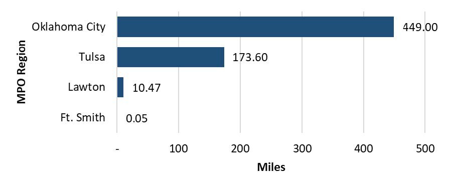 ODOT’s bicycle and pedestrian needs were estimated by examining regional long range plans bicycle/pedestrian plans, prior TAP funding requests, and conferring with ODOT and MPO staff directly. In MPO regions, each MPO’s planned mileage of bike routes, bike lanes, and shared use paths or trails from 2020-2045 is gathered. The figure below shows the existing mileage of bike routes, bike lanes, and shared-use paths or trails in Oklahoma’s four MPO regions. These regions are planning to expand the mileage, often by large amounts. For instance, the Frontier MPO plans an additional 15.60 miles, and the Lawton MPO plans an additional 64.26 miles. The MPOs consider bicycle and pedestrian needs as a part of their long range planning and identify costs for these non-motorized modes of travel in the regional transportation plans. MPOs are required to develop financially constrained MTPs, thus estimated costs cannot exceed reasonably expected revenue.