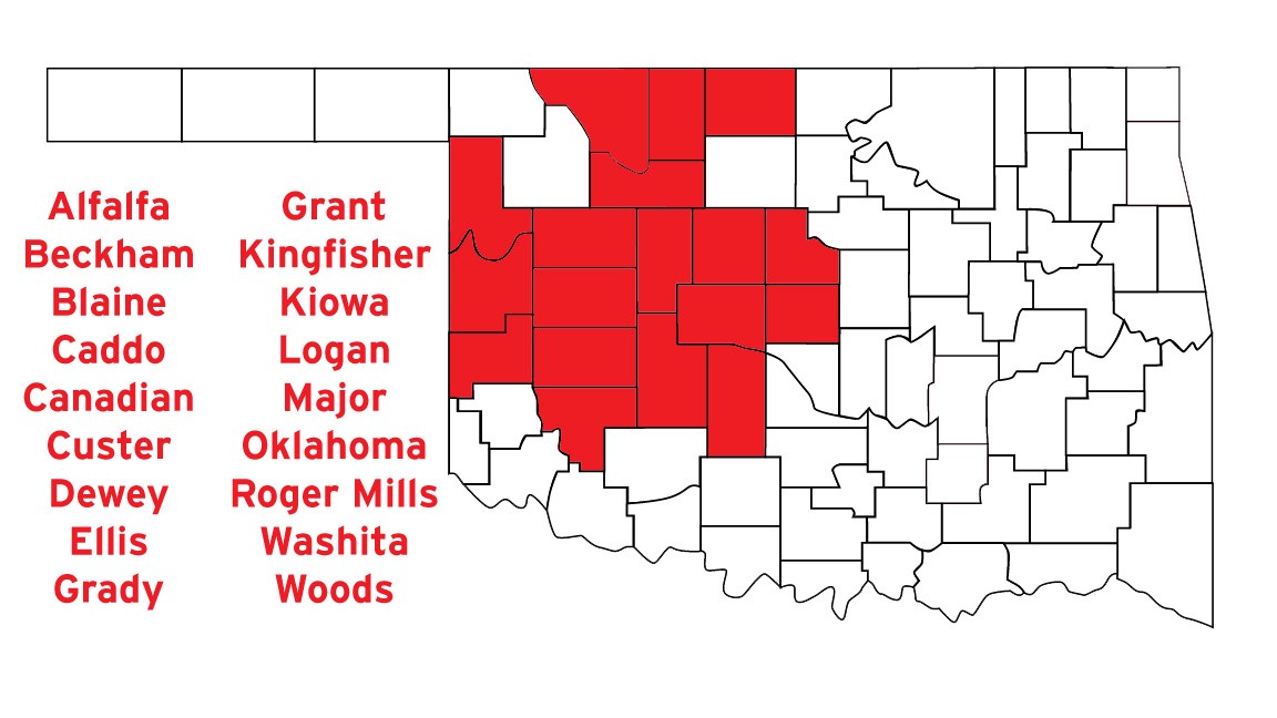 Disaster assistance is approved for Alfalfa, Beckham, Blaine, Caddo, Canadian, Custer, Dewey, Ellis, Grady, Grant, Kingfisher, Kiowa, Logan, Major, Oklahoma, Roger Mills, Washita and Woods counties.