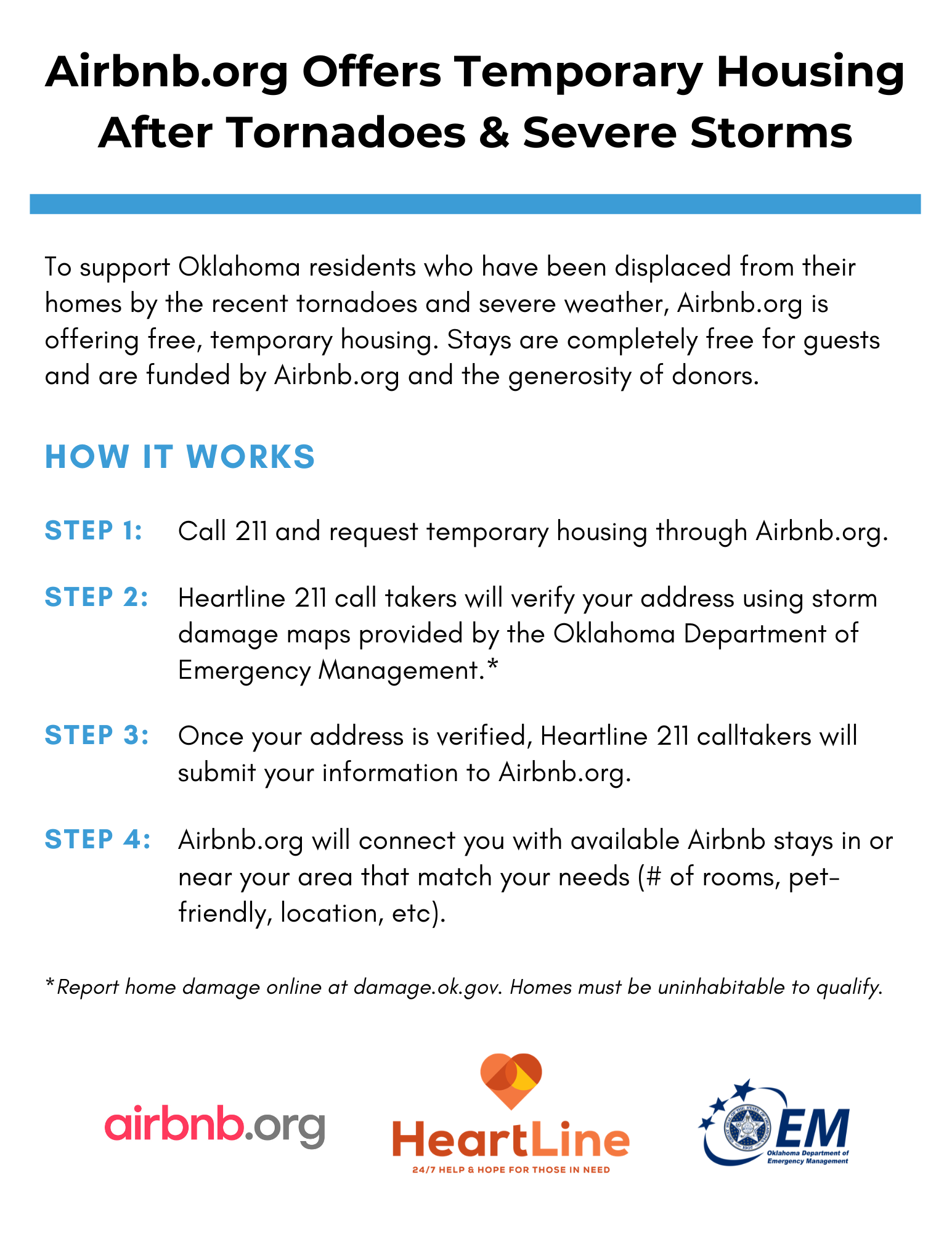 Temporary Housing - To support Oklahoma residents in any county who have been displaced from their homes by the recent severe storms, Airbnb.org is offering free, temporary housing in partnership with Heartline 211. Stays are completely free for guests and are funded by Airbnb.org and generous donors. Call 211 to sign up.