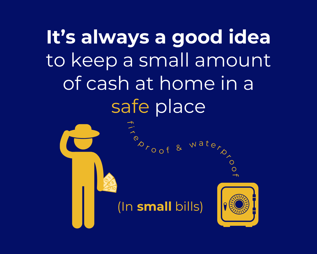 🔴 Keep emergency cash in small bills at home in a safe place, such as your fireproof and waterproof safe.