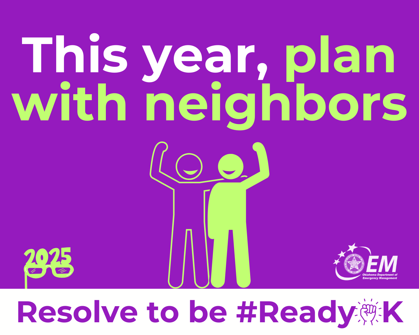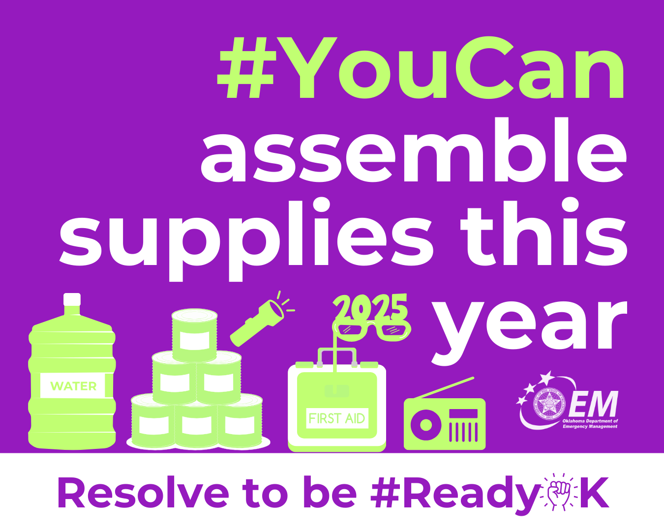 This toolkit was released in celebration of New Year 2025, and aimed to encourage Oklahomans to make any aspect of individual and household preparedness their resolution. This campaign reviewed the major themes focused on in the Oklahoma Department of Emergency Management's 12 Ways to Prepare Campaign in 2024, including making a plan, making an emergency kit and getting involved in community.