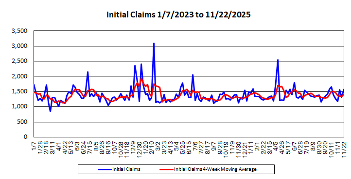 For the file week ending November 22, the number of initial claims, unadjusted, totaled 1,581, an increase of 260 from the previous week's level of 1,321. For the same file week, the less volatile initial claims 4-week moving average was 1,412, an increase of 79 from the previous week's average of 1,333.