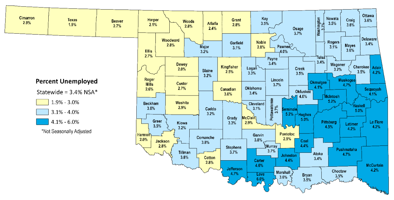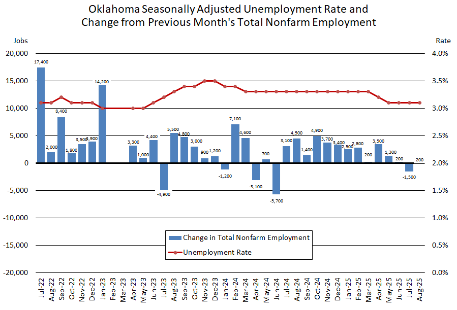 August 2025: Oklahoma's unemployment rate held steady at a seasonally adjusted 3.1 percent while nonfarm payroll employment added 200 jobs (0.0 percent) over the month.