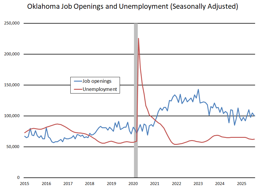 August 2025: Oklahoma's number of job openings and the number of unemployed persons little changed over the month.