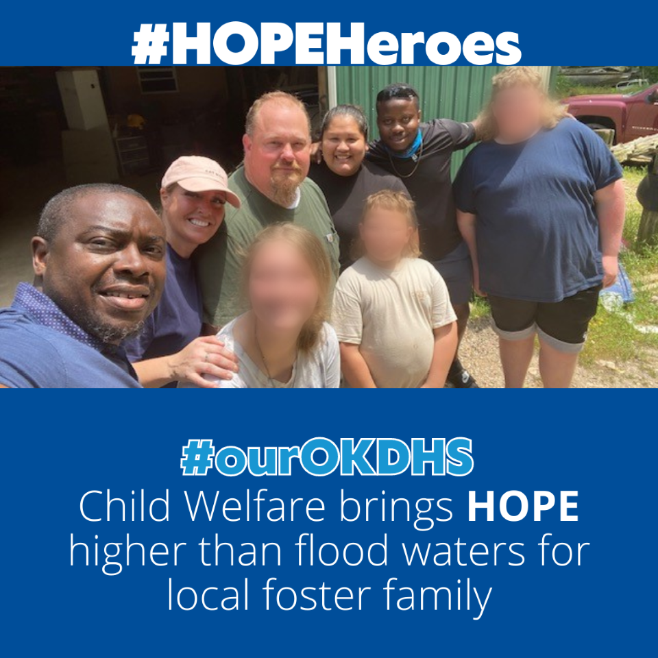 Oklahoma Human Services’ (OKDHS) employees build hope every day by creating pathways for customers, even when the original pathways are flooded. This was the case recently for a Cherokee County foster family when their local child welfare team stepped in to offer help and hope when their home and belongings were overtaken by flood waters.