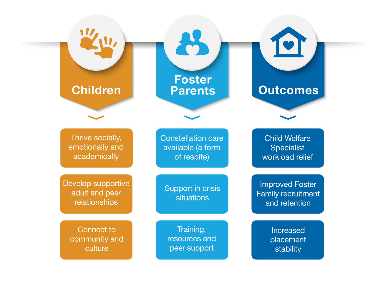 Children and youth placed in a satellite home will experience enhanced support in the areas of support in problem solving, access to self-requested constellation care (a form of respite) with a care giver they know and trust, multiple opportunities to develop permanent connections, intentional connection to their native culture and increased opportunities for quality interactions with their biological families.
