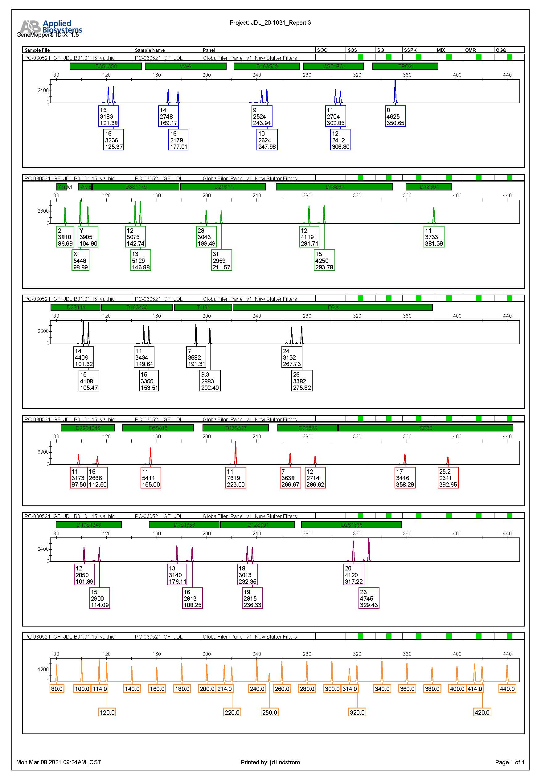 The amplification process generates billions of copies of a particular sequence from the DNA strand in the sample. This is accomplished using the polymerase chain reaction (PCR). PCR is an enzymatic process in which a specific region of DNA is replicated over and over again to yield many copies of a particular sequence. The amplified areas on the DNA are called short tandem repeats (STRs). These highly variable regions among individuals make them effective for human identification purposes. The OSBI FBU utilizes two amplification kits from Applied Biosystems. The GlobalFiler Amplification kit is used for Autosomal (STR) DNA analysis, and the Yfiler Plus Amplification Kit is used for male-specific (Y-STR) DNA analysis.