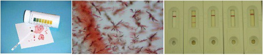 The confirmatory test used to confirm the presence of blood in the FBU is the Takayama test. This is a crystalline test that is viewed using a microscope. A small cutting of the stain is placed on a microscope slide, and the reagent is allowed to flow between a cover slip and the sample to saturate the sample. The test is positive if the analyst observes pink or red, rhomboid or needle shaped crystals (microcrystalline characteristics) that exhibit birefringence under plane polarized light. This test will confirm only that blood is present and is not species specific. The test works regardless of the blood being human or animal.