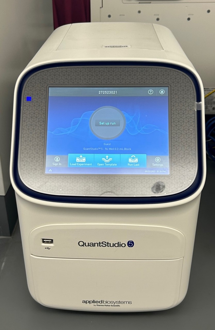 The quantification process estimates the amount of DNA in the sample for downstream analysis purposes and ensures human DNA is present in the sample. The quantification kits utilized are human specific. The OSBI FBU uses a quantitation kit from Applied Biosystems, the Quantifiler Trio kit. The samples are analyzed with the QS5 instrument from Applied Bio Systems.