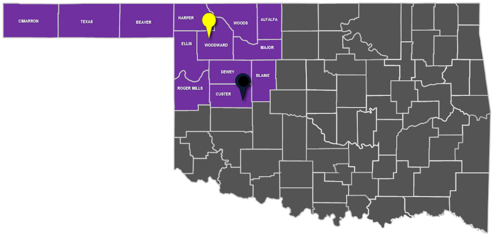 Alfalfa, Beaver, Blaine, Cimarron, Custer, Dewey, Ellis, Harper, Major, Roger Mills, Texas, Woods, Woodward