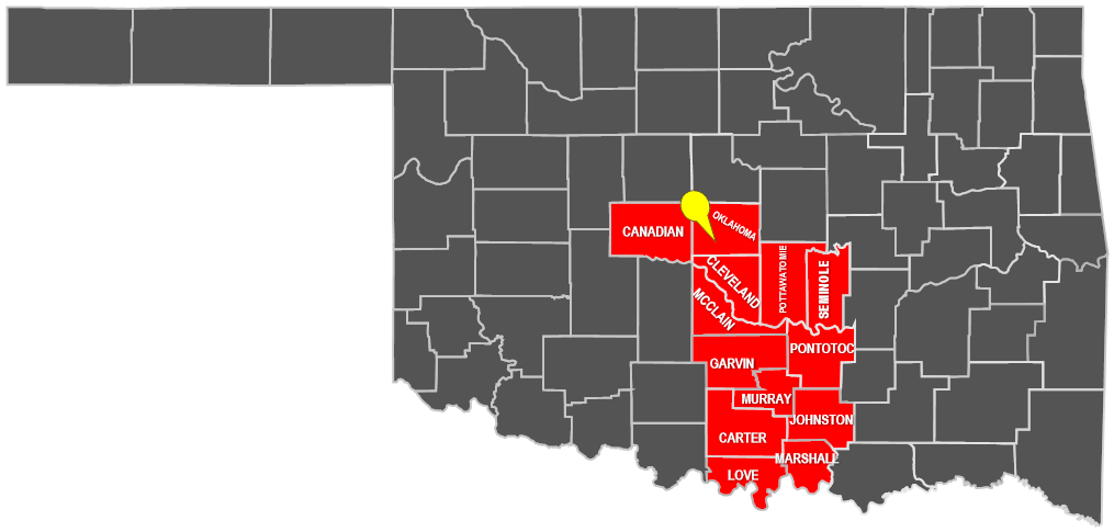 Canadian, Carter, Cleveland, Garvin, Johnston, Love, Marshall, McClain, Murray, Oklahoma, Pontotoc, Pottawatomie, Seminole