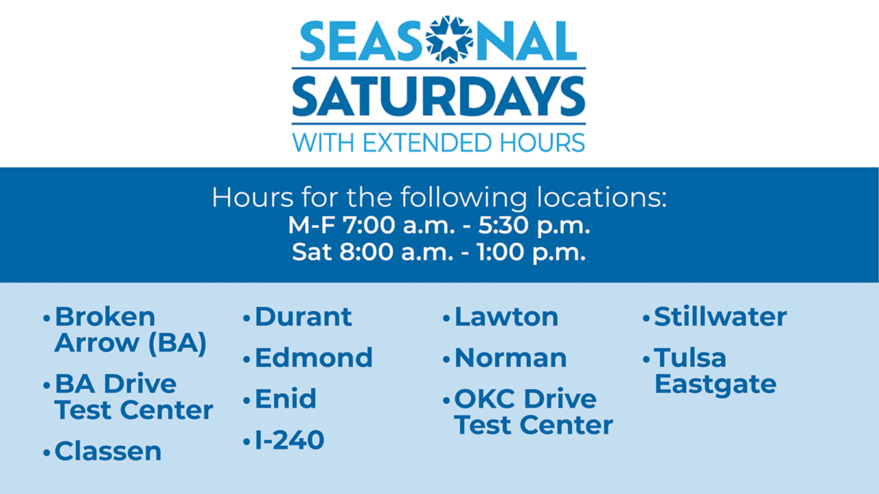 Seasonal Saturdays have been added to help citizens who have limited availability during the week to visit a Service Oklahoma Licensing and Exam and Drive Test Center location. Beginning in March, the strategically selected locations will now be open Monday through Friday from 7:00 a.m. to 5:30 p.m. and on Saturdays from 8 a.m. to 1 p.m.