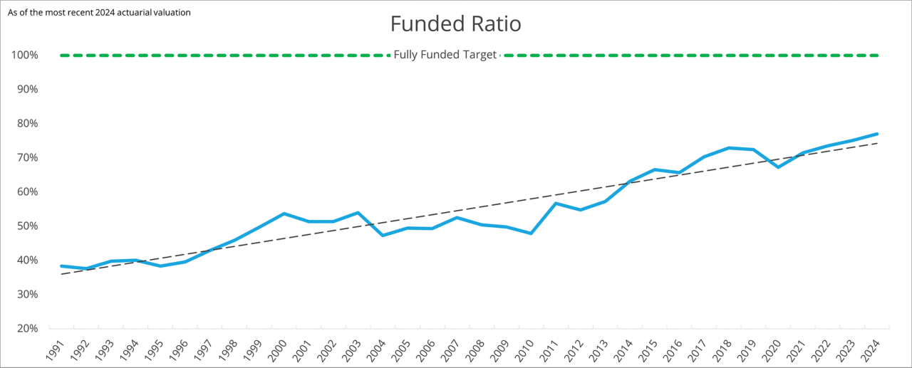 Our long-term goal is to become fully funded by earning our actuarial return assumption and encouraging a responsible funding policy. Over the years, the fund has made significant progress in achieving a healthy funded ratio. Below is a chart that shows the funded ratio over the last thirty years.