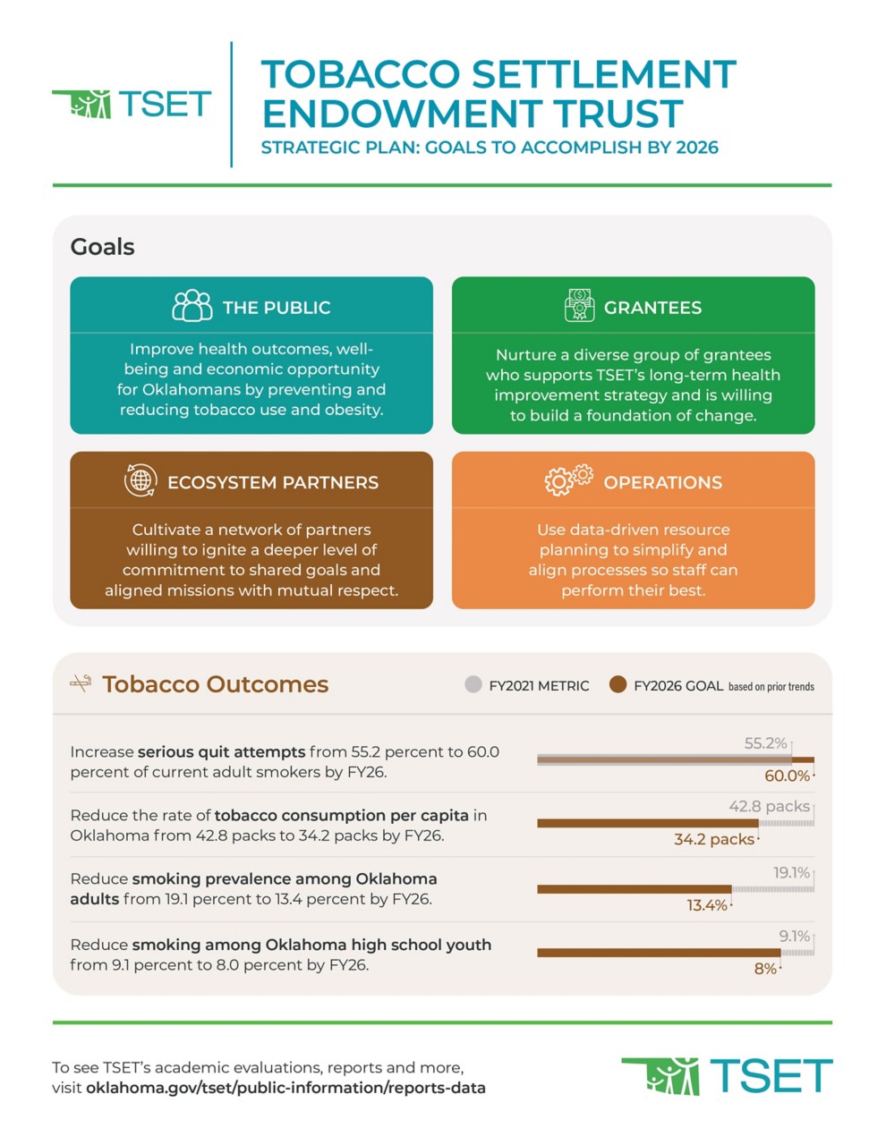 TSET's mission is to improve Oklahomans' health and quality of life by achieving targeted improvements in the health of Oklahomans. We focus program investments on high-impact priorities that reduce the leading causes of death in Oklahoma – cancer and cardiovascular disease. TSET does that by preventing and reducing the leading risk factors for those diseases, tobacco use and obesity. We also invest in high-priority research with an emphasis on reducing the toll of tobacco-related cancers. To achieve this objective, TSET funds accountable programs and services that address the hazards of tobacco use and other health issues. We employ an evidence-based strategic plan to achieve our objectives and evaluate the effectiveness of our grants and programs.