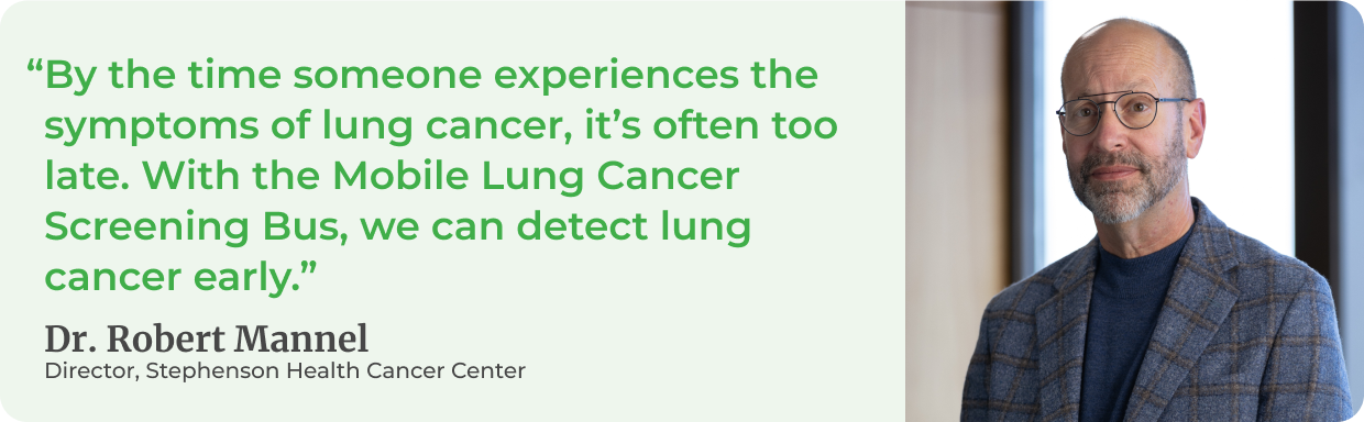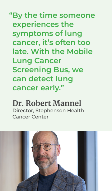 Oklahoma has one of the highest lung cancer rates in the nation. That's why TSET partnered with OU Health Stephenson Cancer Center to create the state’s first mobile lung cancer screening bus, bringing lifesaving care to every county. The screening process is quick, painless and can detect lung cancer early — when it's the most treatable. Don't wait for symptoms.